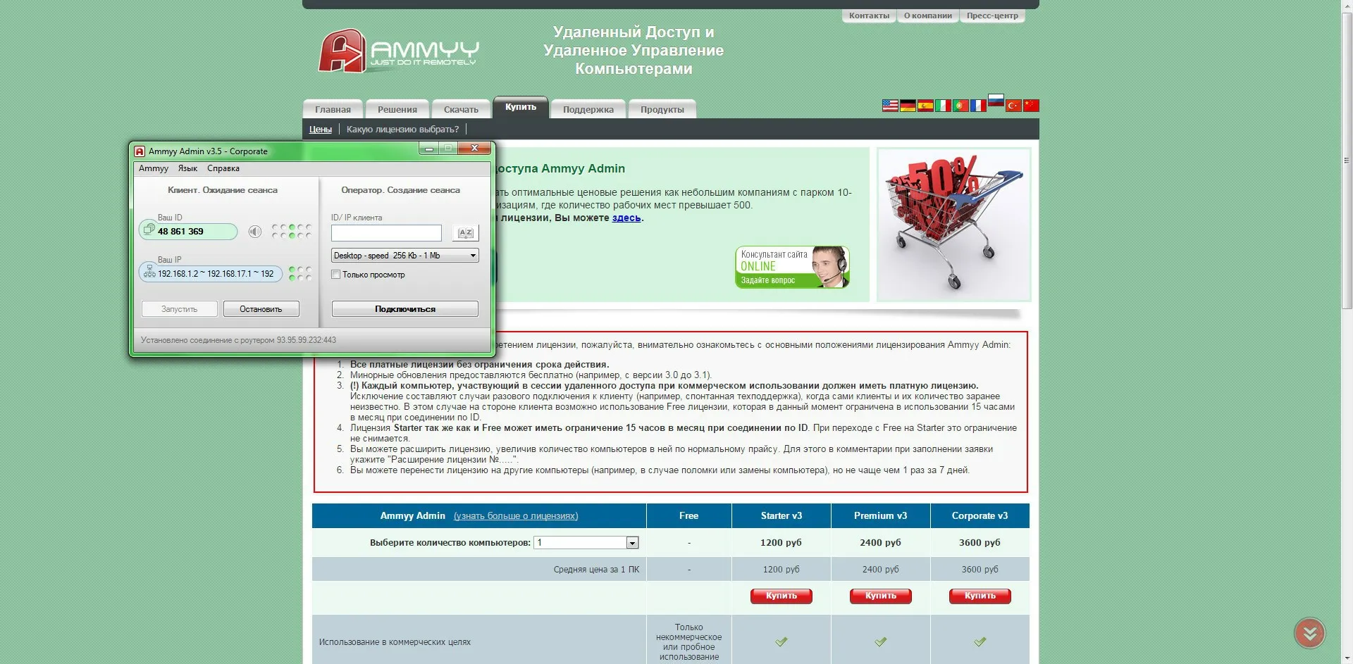 Ammyy Admin (Амми Админ) – система удаленного доступа к компьютерам и серверам. В некоммерческих целях можно использовать утилиту бесплатно, а для остальных случаев предлагаются 3 тарифа с дополнительными возможностями.